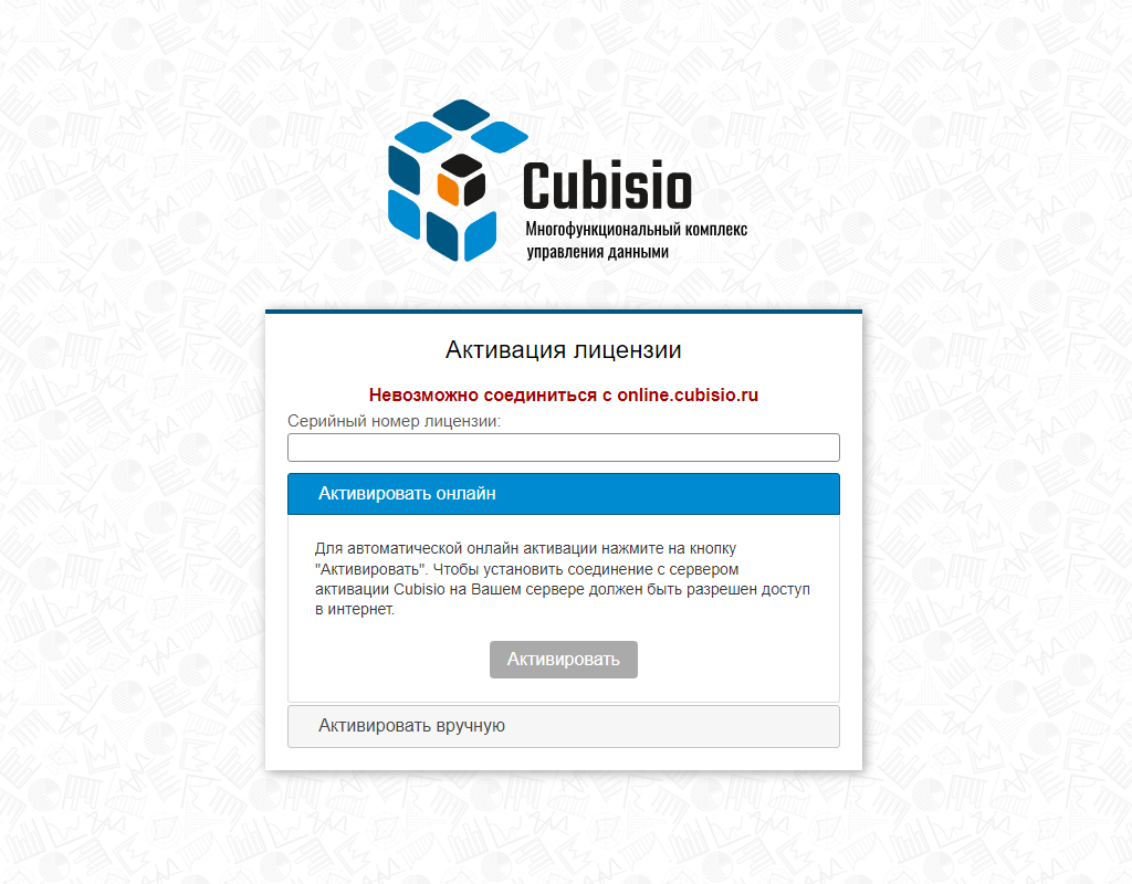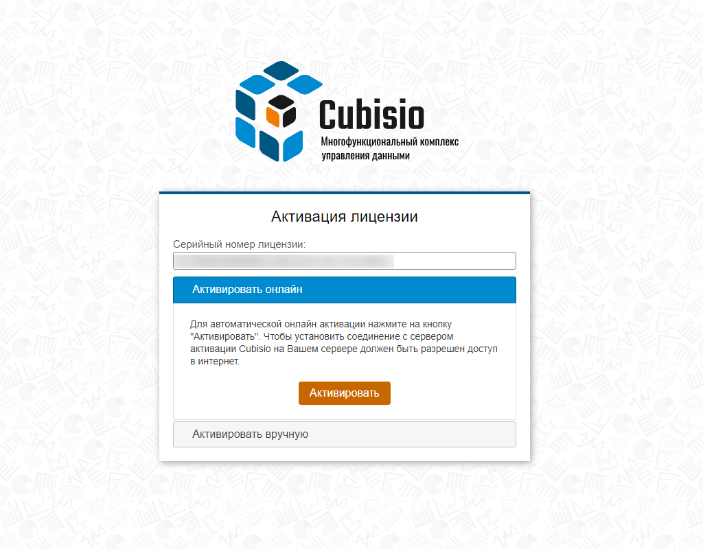 После развертывания ПО Cubisio на сервере для проведения активации выполните следующие шаги: