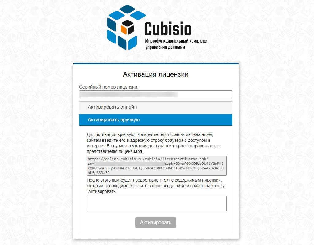 4. Если вы выбираете ручной способ активации в программном обеспечении Cubisio, система сгенерирует строку запроса, которую вы можете скопировать и ввести в адресную строку веб-браузера на любом АРМе с доступом в интернет. При этом, убедитесь, что серийный номер лицензии корректно введен в соответствующее поле. Также строку запроса можно передать представителю компании лицензиара для генерации файла с лицензией. Представитель компании сгенерирует файл с лицензией, который вы сможете использовать для активации программного обеспечения Cubisio.