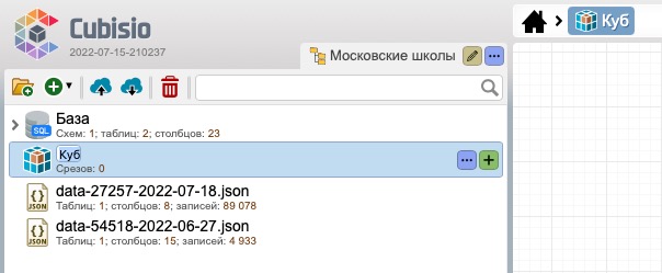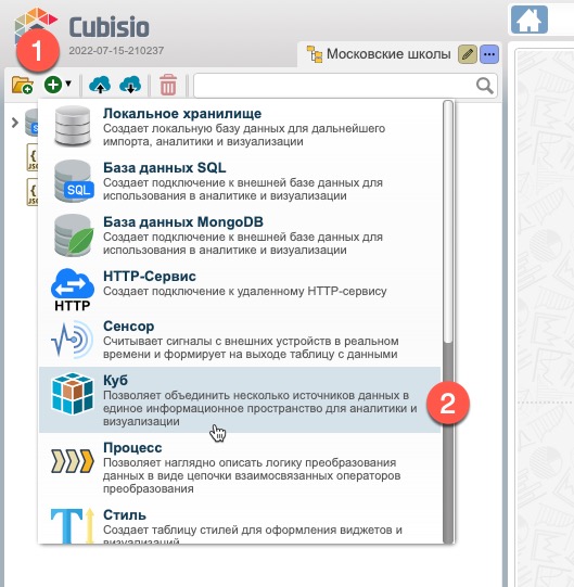 Для создания нового куба (рис. 25) последовательно нажмите на кнопку “+” (1) панели инструментов и выберите строку “Куб” (2).