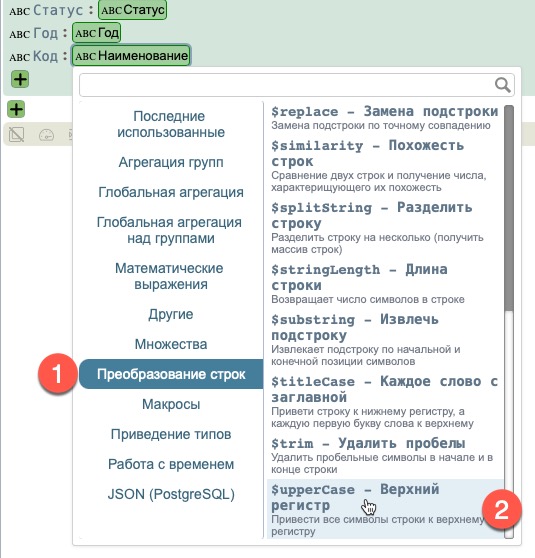для чего оберните поле “Наименование” (рис. 32) функцией upperCase (группа “Преобразование строк” (1) - функция $upperCase (2)) (рис. 33).