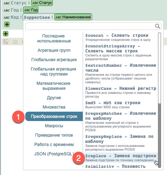Дополнительно оберните созданную конструкцию (рис. 34) и последовательно выберите группу “Преобразование строк” (1) и функцию “$replace” (2).