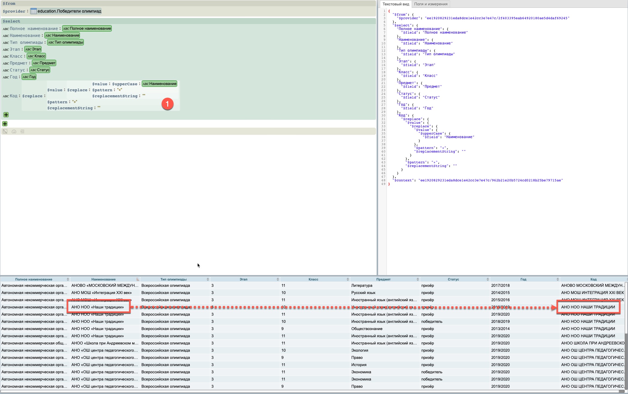 Аналогичные действия проделайте в срезе “Образовательные организации”. В результате в срезе появится новое поле "Код", содержащее данные поля “Наименование”, очищенные от кавычек и переведенные в верхний регистр.