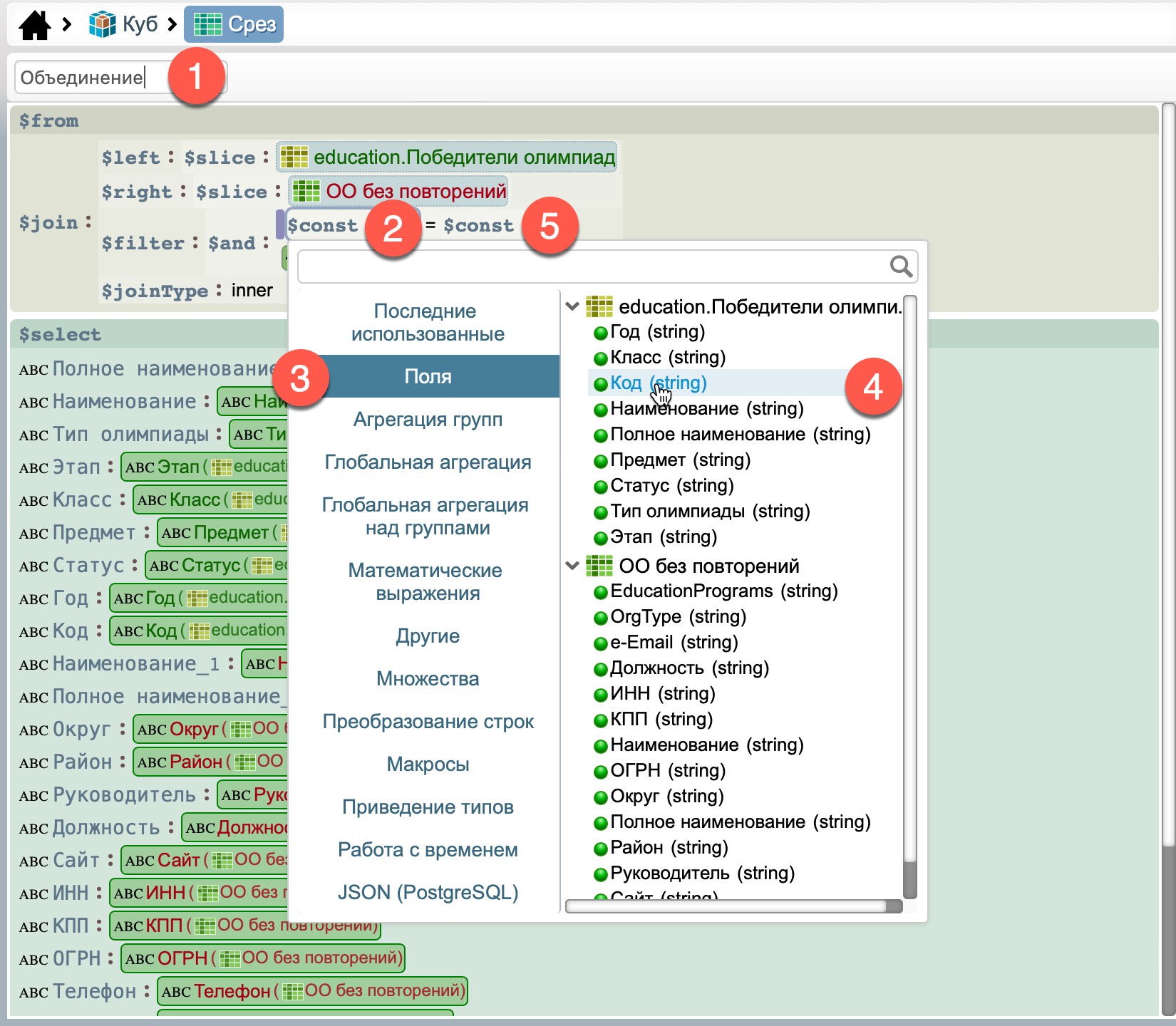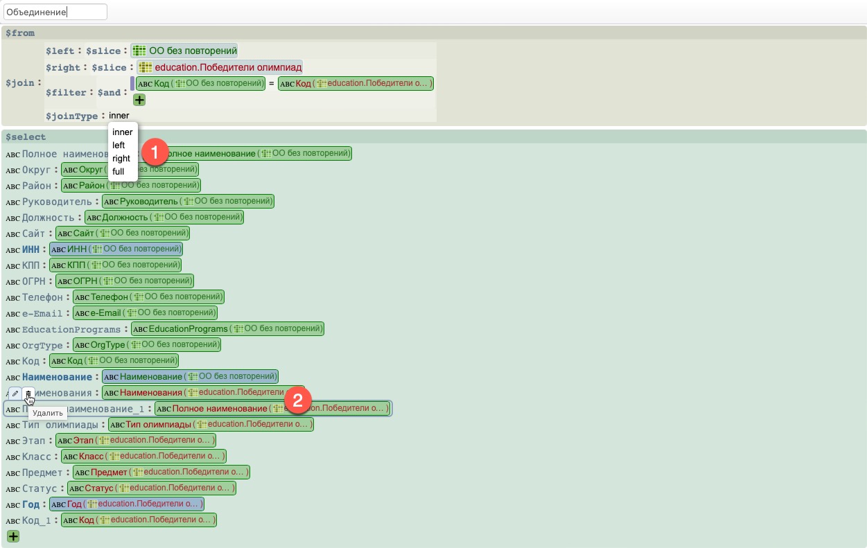 После выбора связующих поле выберите тип операции (рис. 45) Join в окне редактора среза (1) (рис. 44) и удалите поля (2):