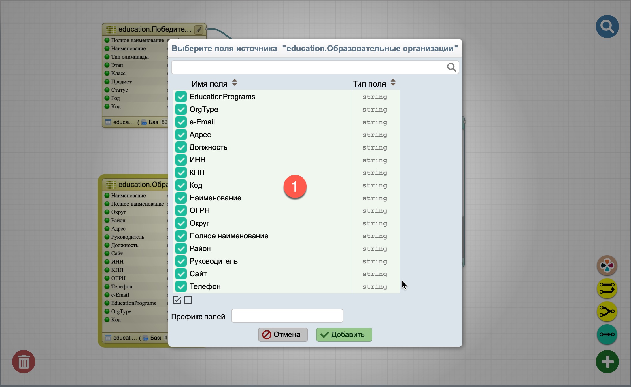 В результате появится срез-копия, ссылающийся на срез источник, в котором с помощью чекбоксов выберите все поля (1) (рис. 39), нажмите на кнопку “Добавить”.