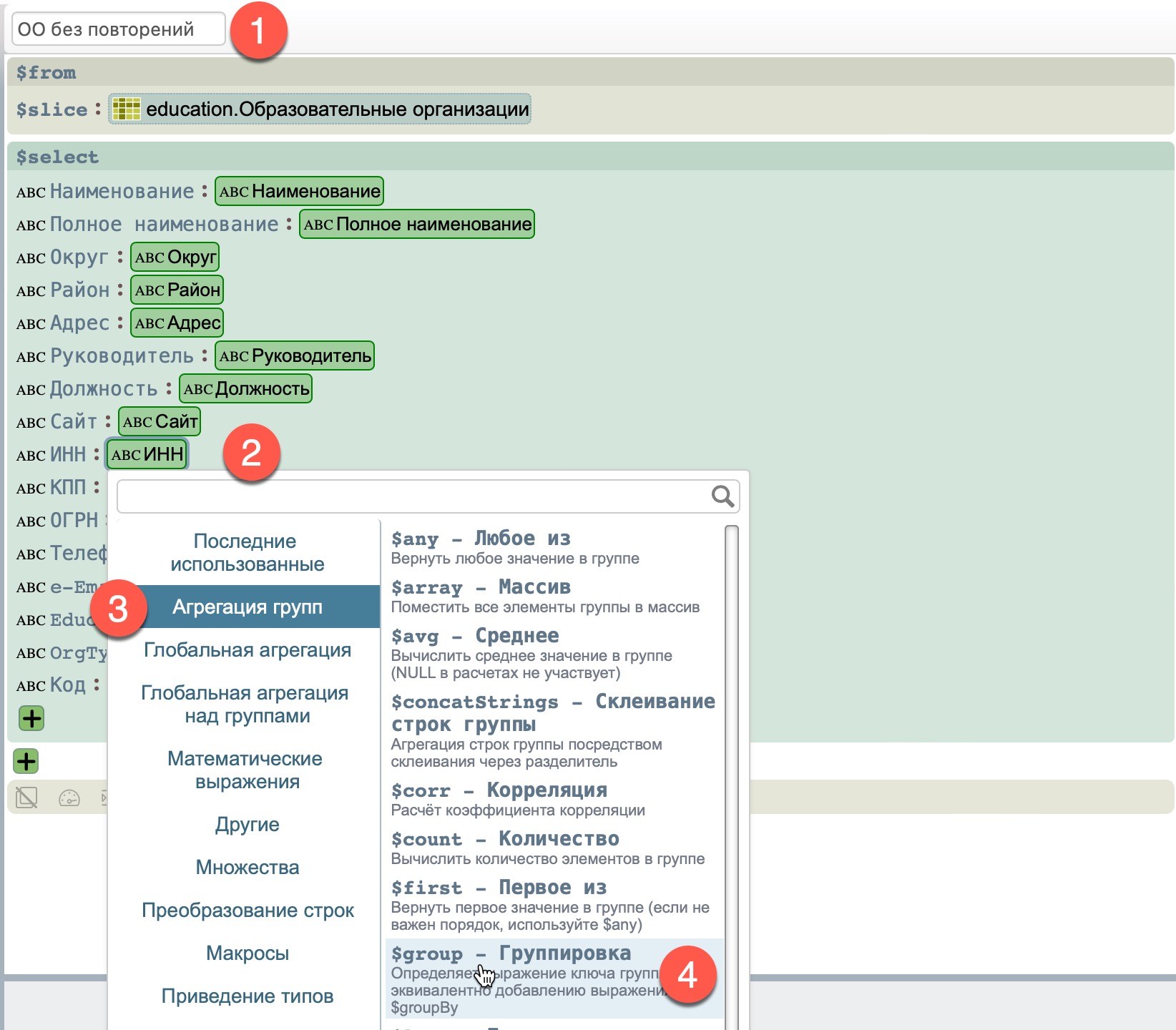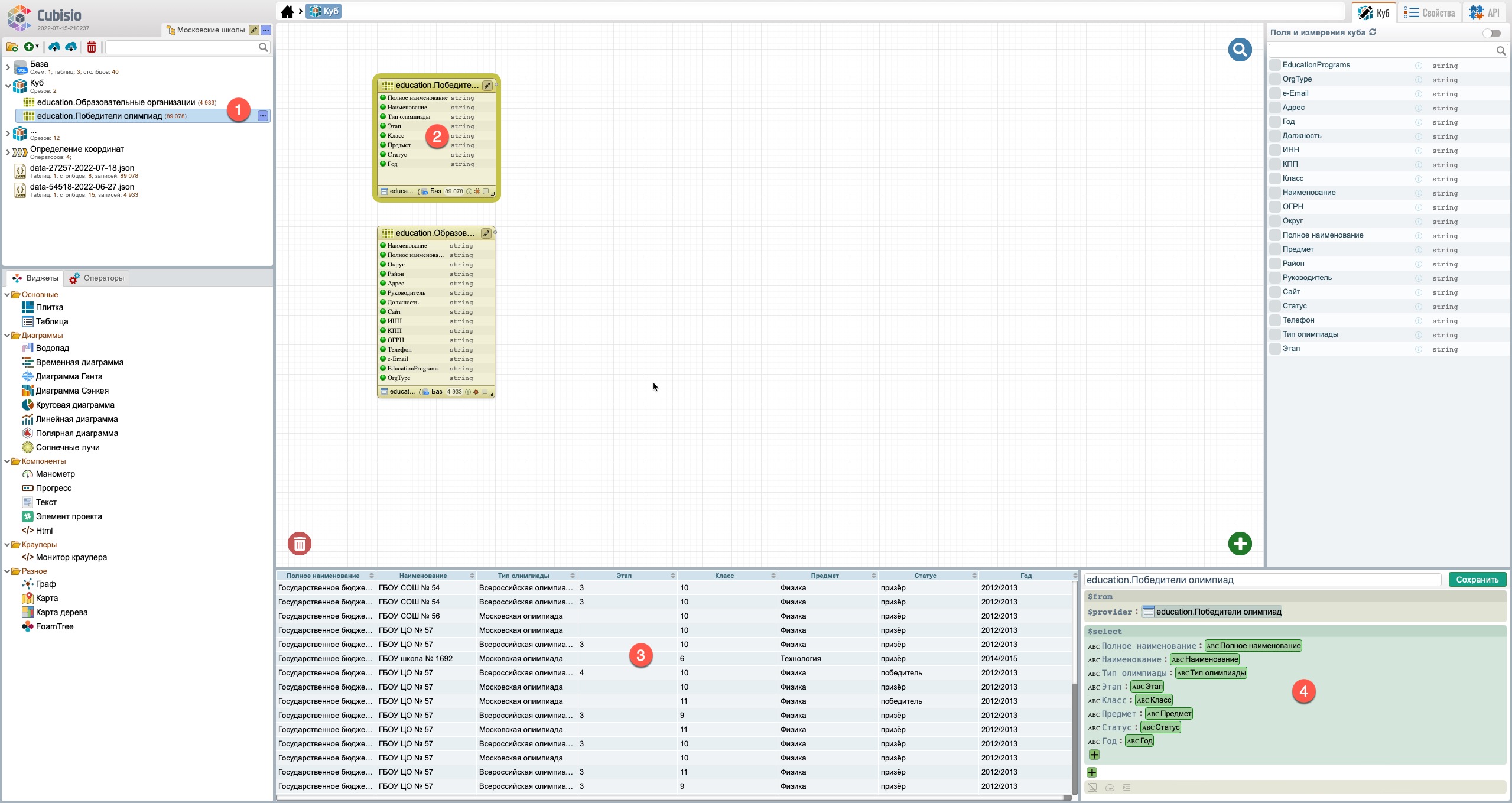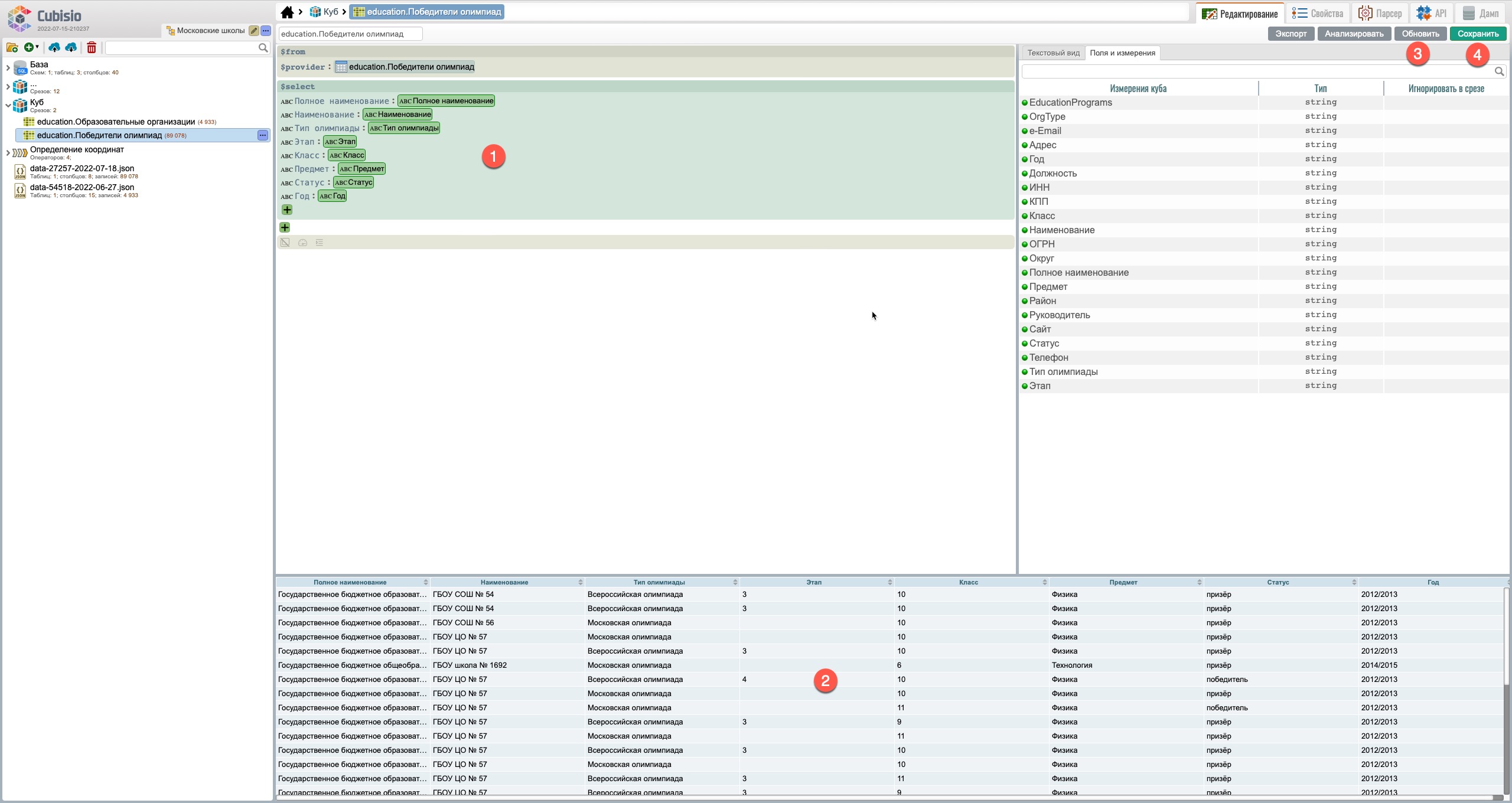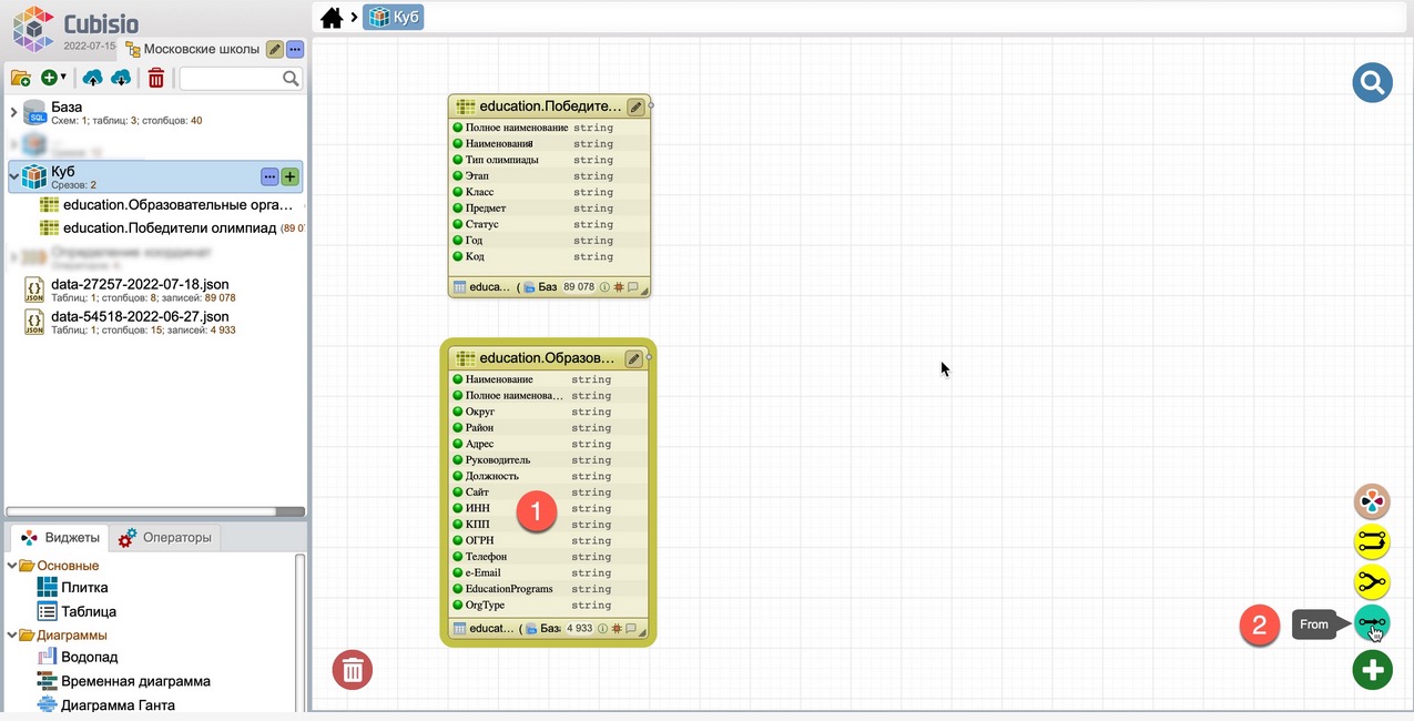 Анализ данных, содержащихся в срезе “Образовательные организации” (1) (рис. 38), показывает, что в нем представлены школы несколькими записями с различными адресами. Для нашей аналитики достаточно одной записи, содержащей наименование школы без адреса. Для это необходимо создать срез - копию среза “Образовательные организации” и оставить в нем только записи с уникальными школами, для чего в рабочей области выберите срез-источник “Образовательные организации” (1), нажмите на кнопку “From” (2).