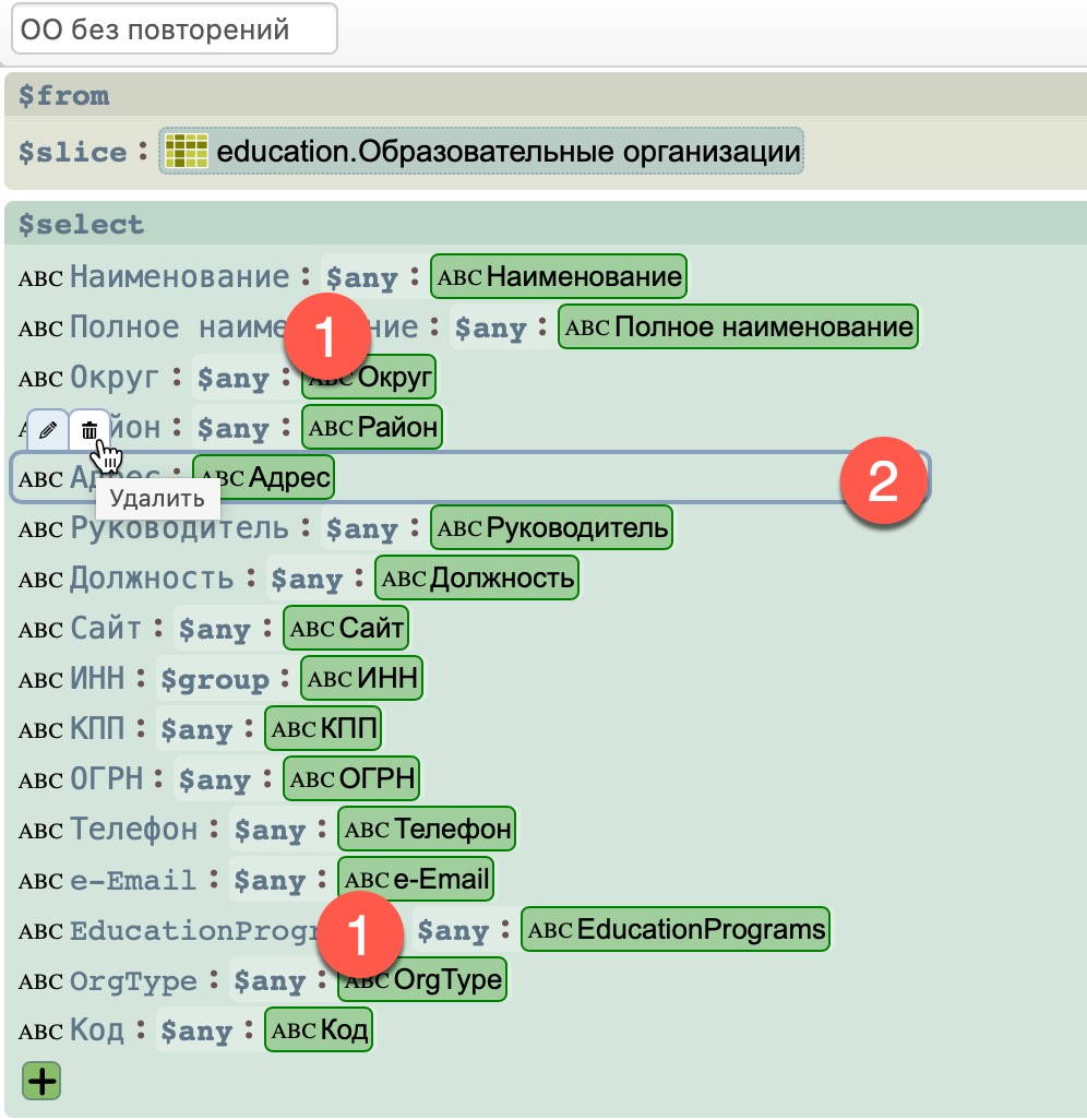 Для остальных полей среза примените функцию $any (1), а поле Адрес удалите (2) (рис. 41).