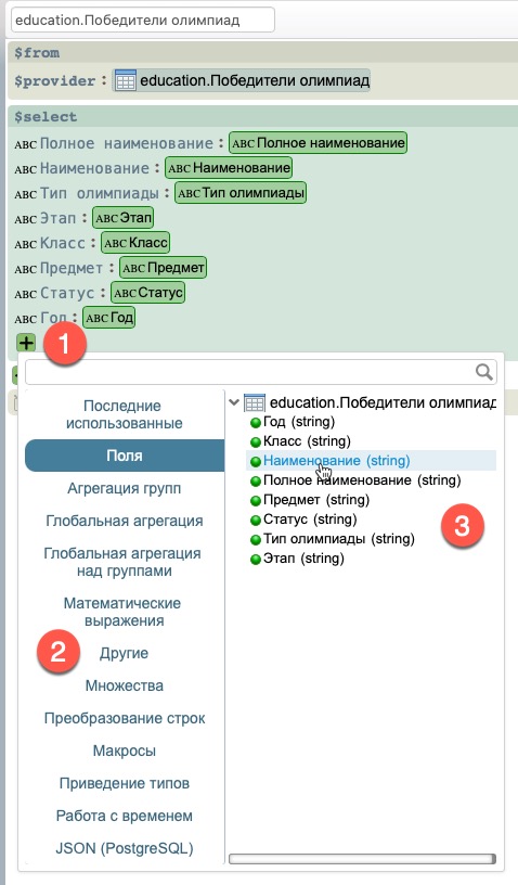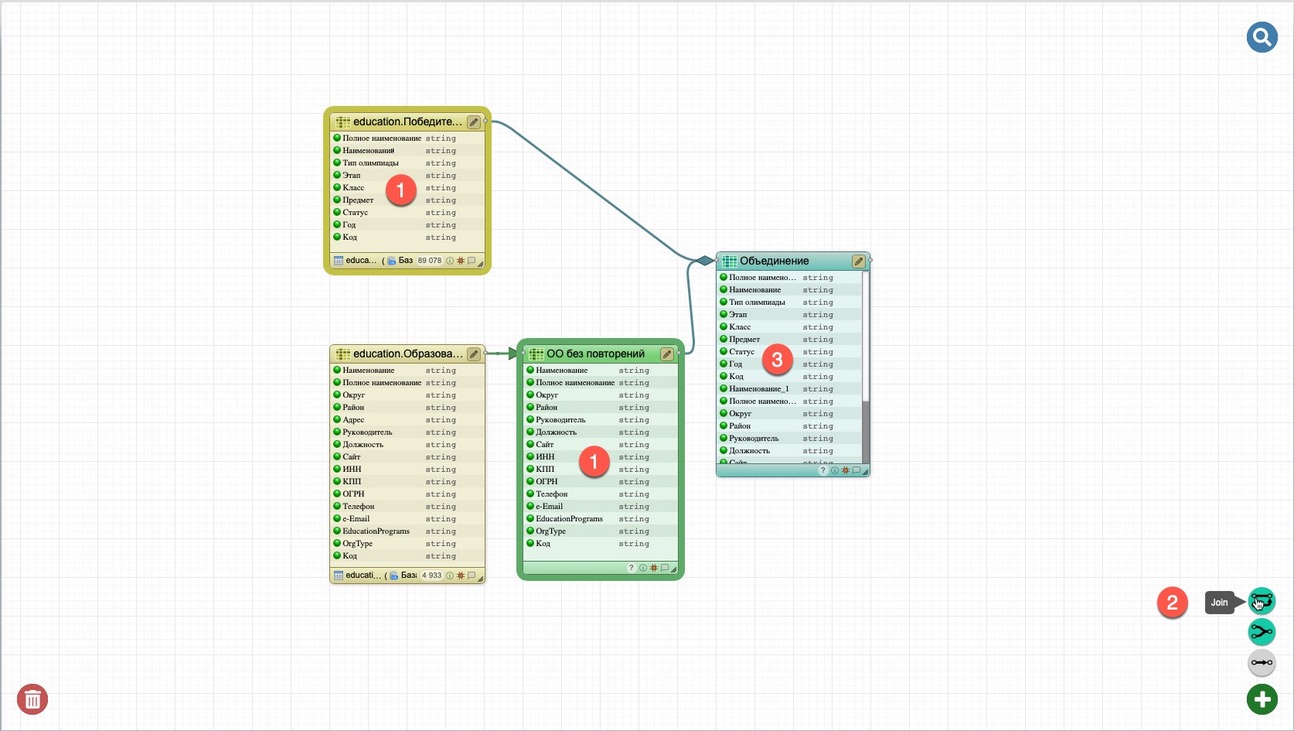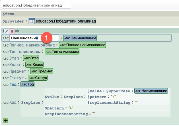 Анализ поля “Наименование” “Образовательные организации” и “Победители олимпиад” показал, что в первом случае в рамках одной школы поле “Наименование” уникально, а во втором срезе имеет несколько вариантов написаний, то в срезе "Победители олимпиад" переименуем поле “Наименование” в "Наименования" (1) (рис. 37).