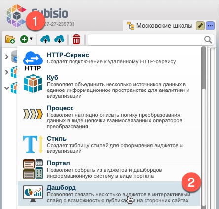 что бы открыть дашборд в новой закладке браузера нажмите на кнопку “Открыть” (2) - в новой закладке откроется дашборд (внешний вид представлен в фиолетовом прямоугольнике);