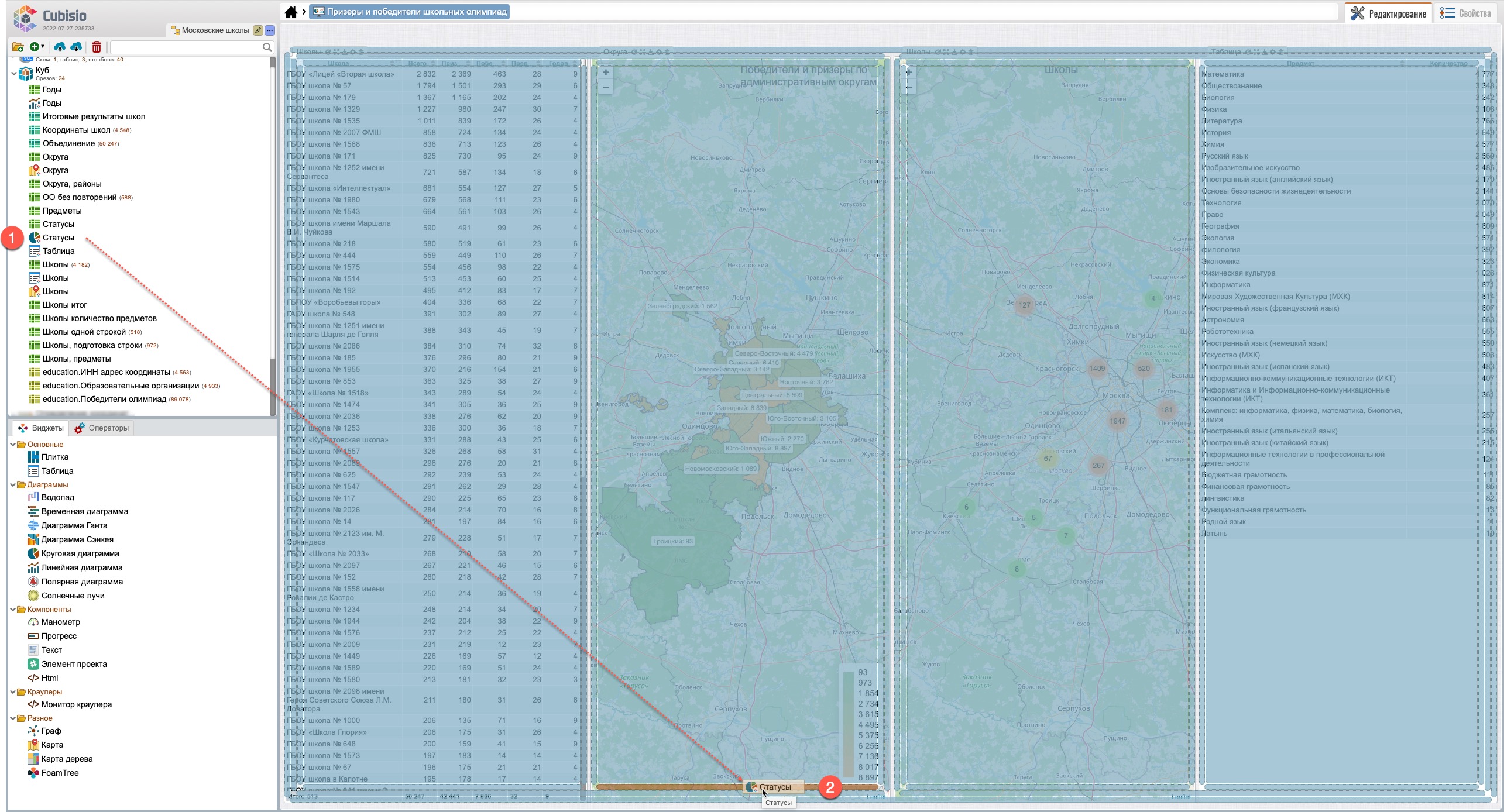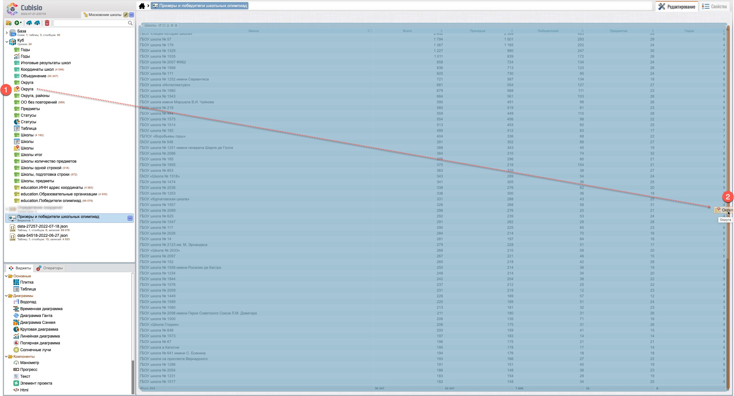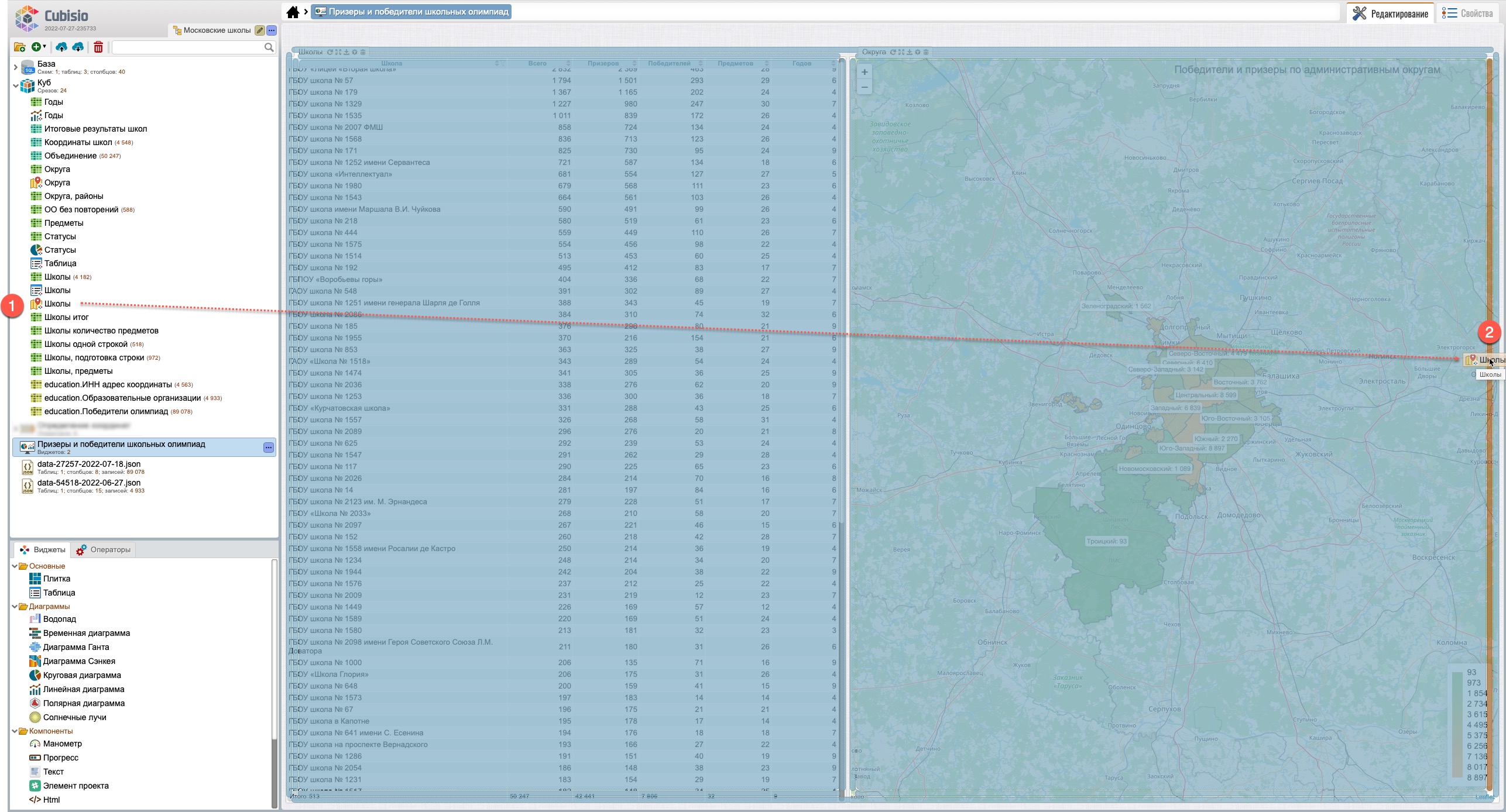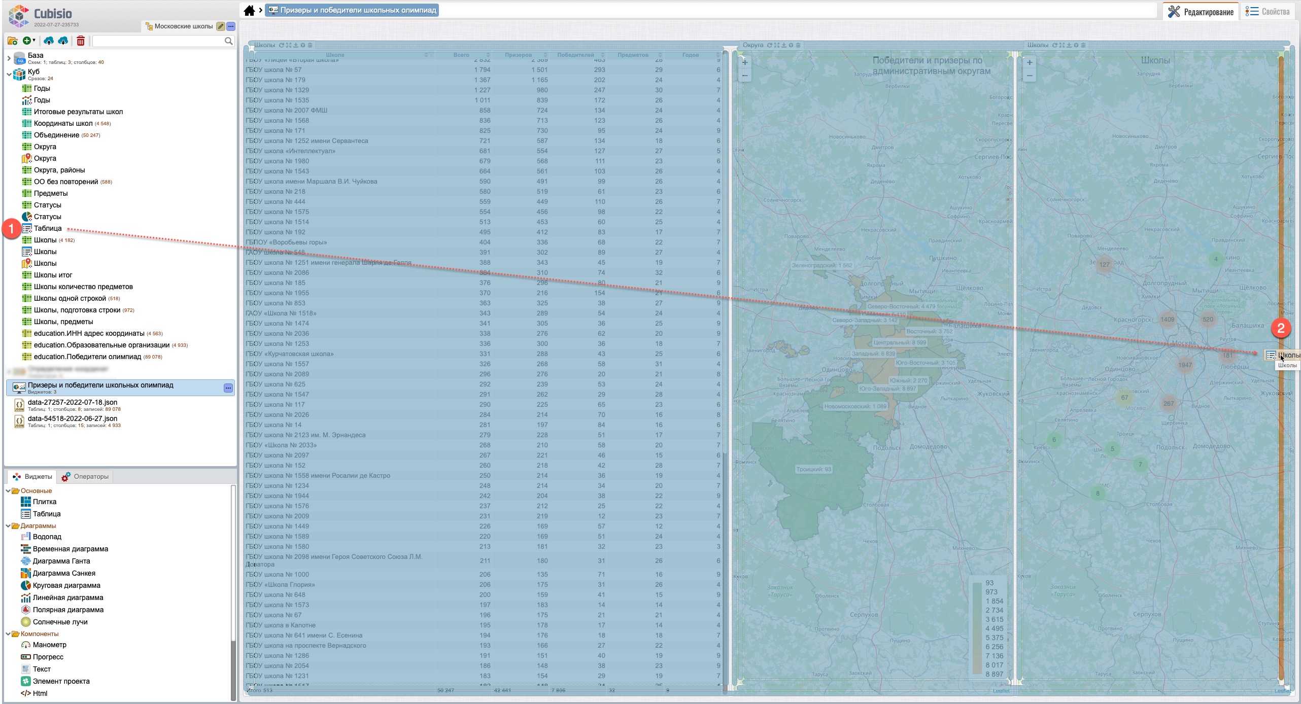 После перемещения виджетов (рис. 103) виджет “Школы” (карты) будет находиться на закладе, рядом с виджетом “Округа” (карта) (1), выбрав которую виджет “Школы” откроется на переднем плане поверх виджета “Округа”.