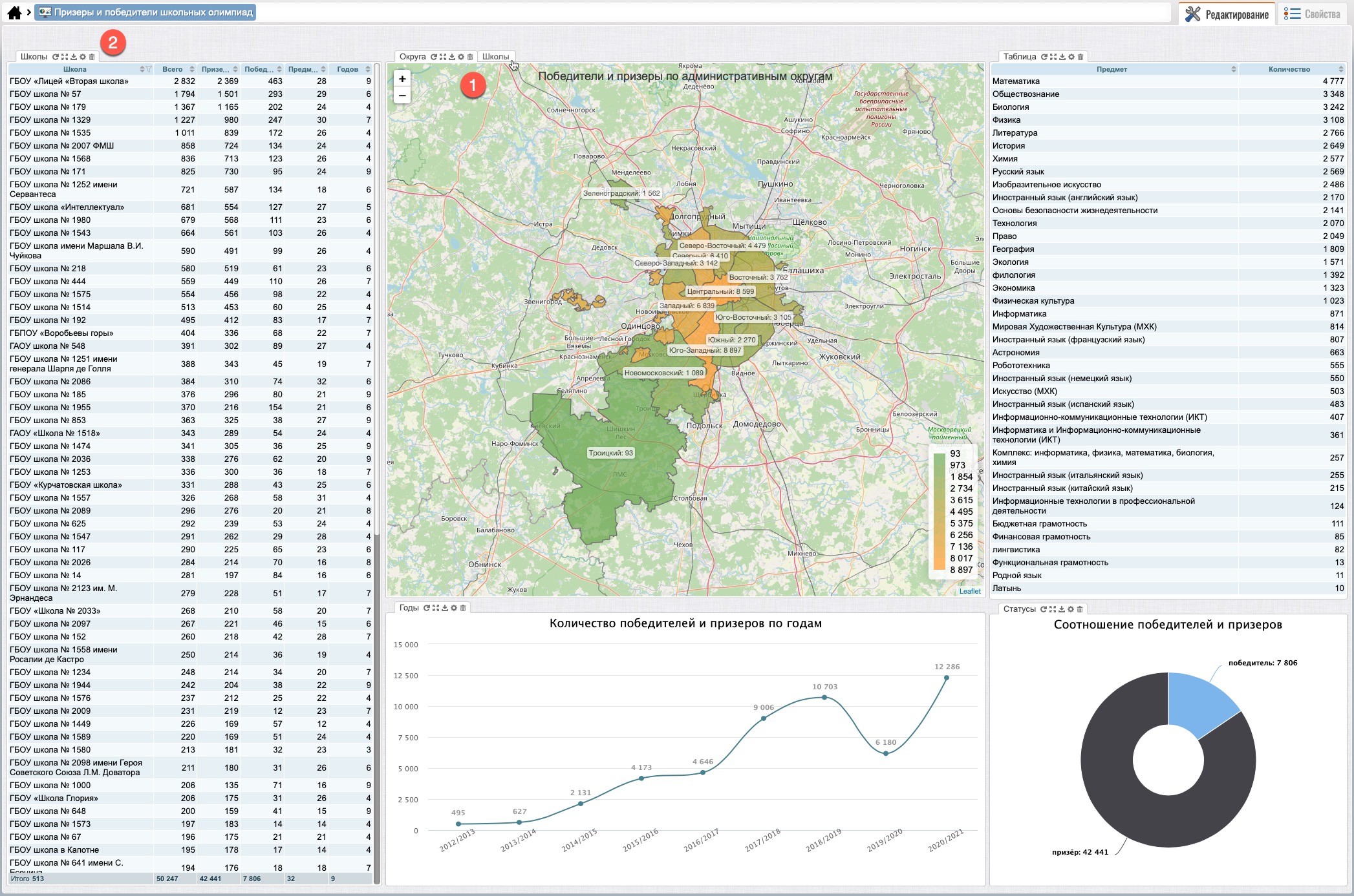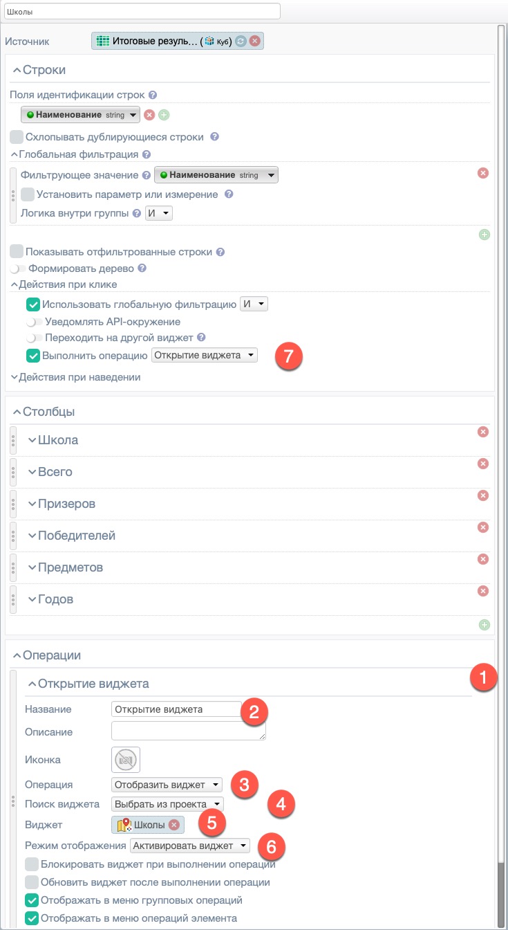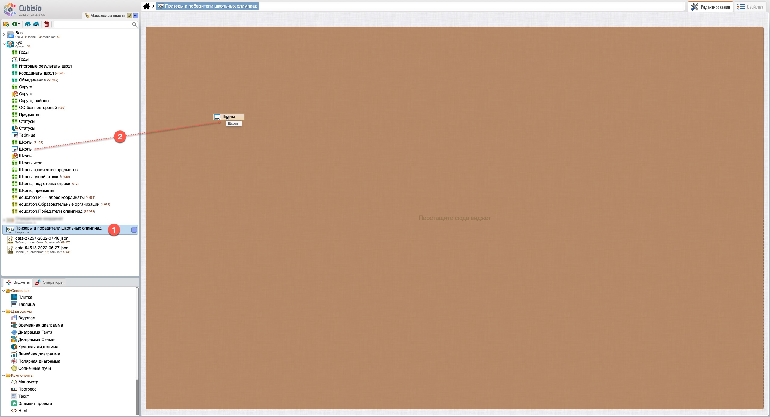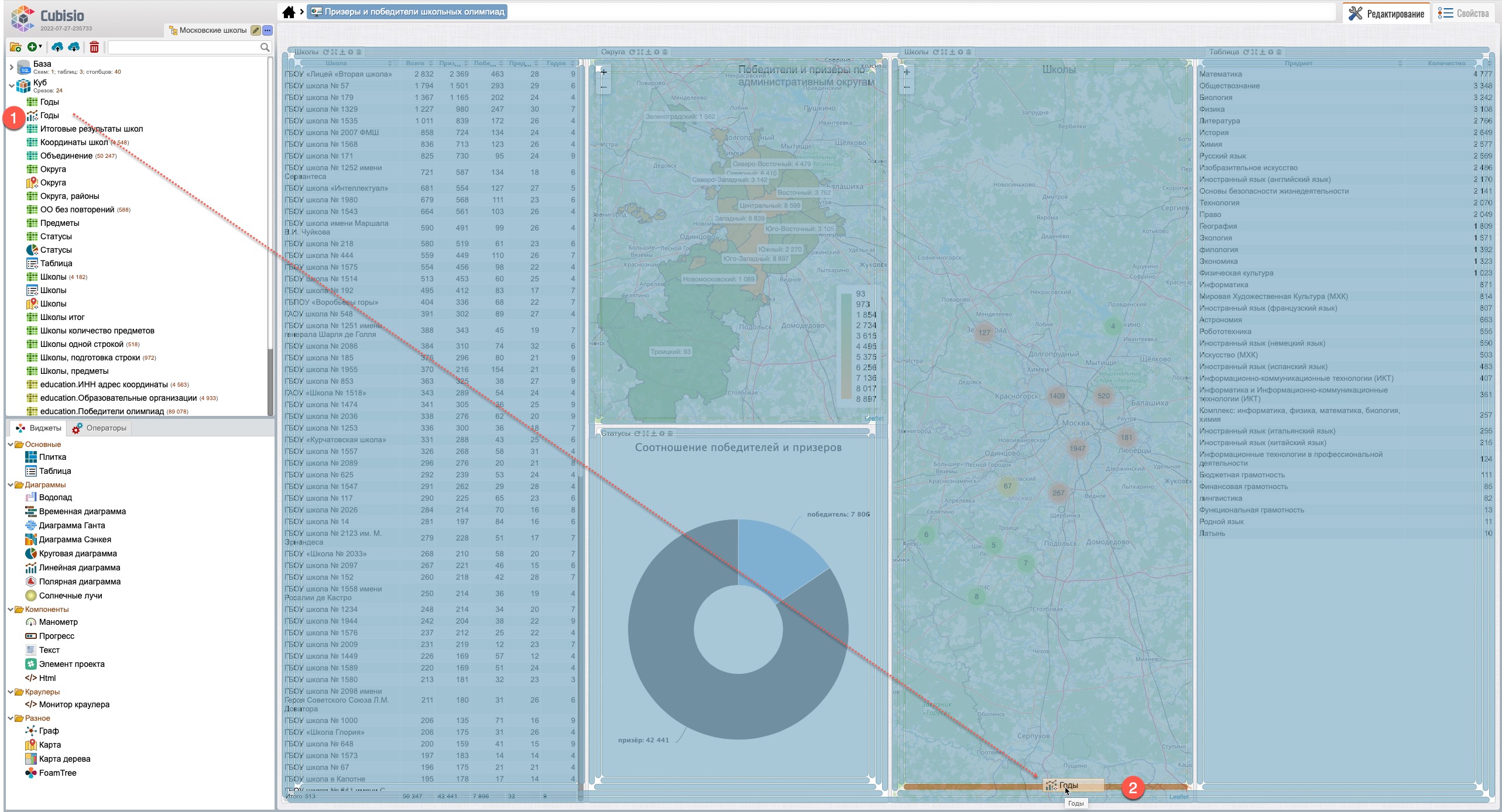 После перемещения виджетов (рис. 103) виджет “Школы” (карты) будет находиться на закладе, рядом с виджетом “Округа” (карта) (1), выбрав которую виджет “Школы” откроется на переднем плане поверх виджета “Округа”.