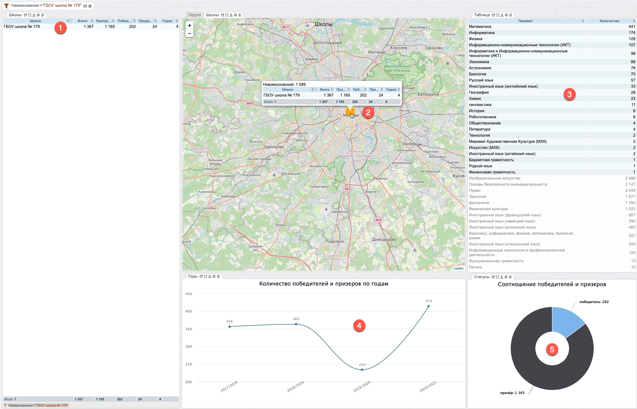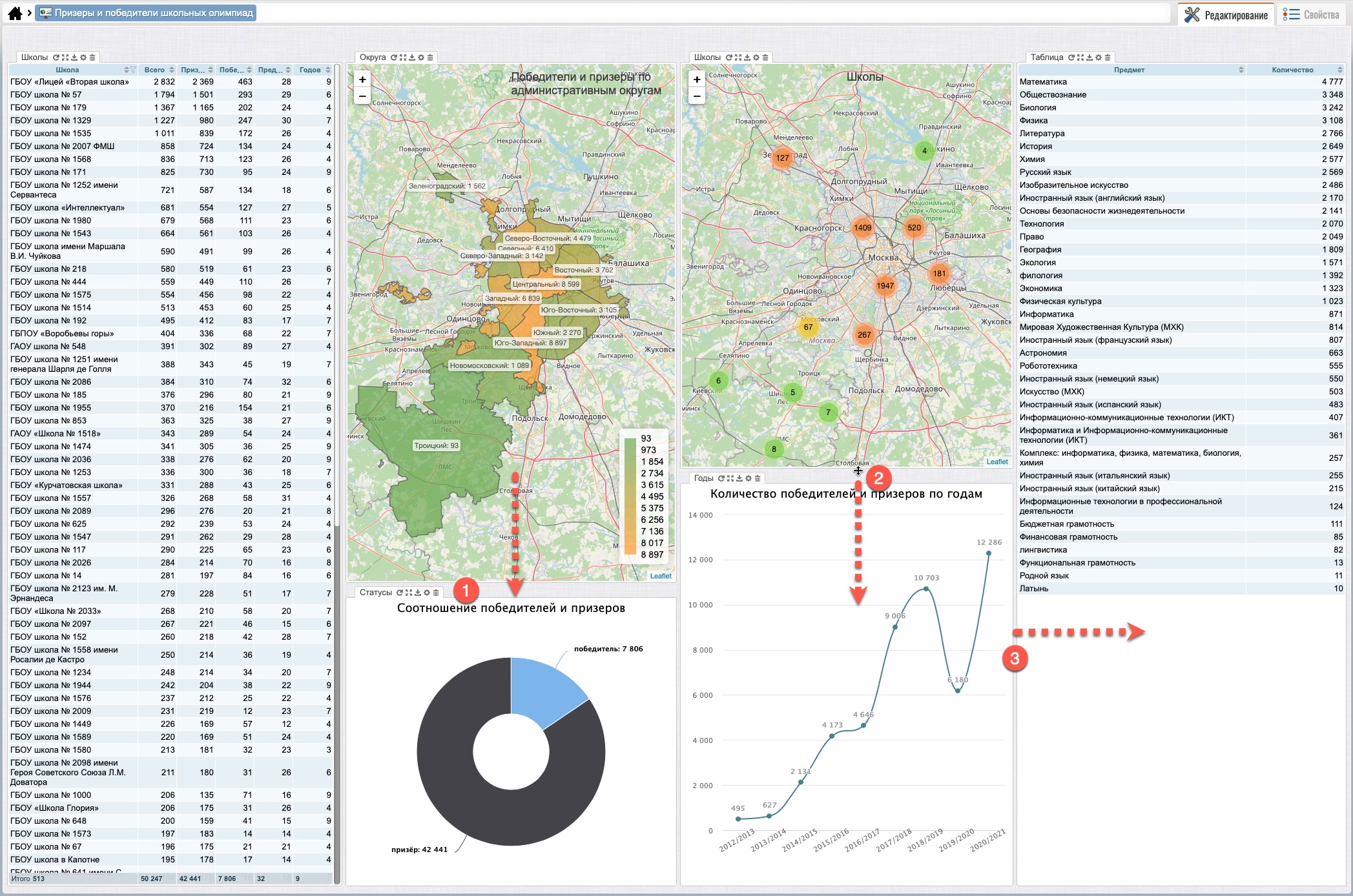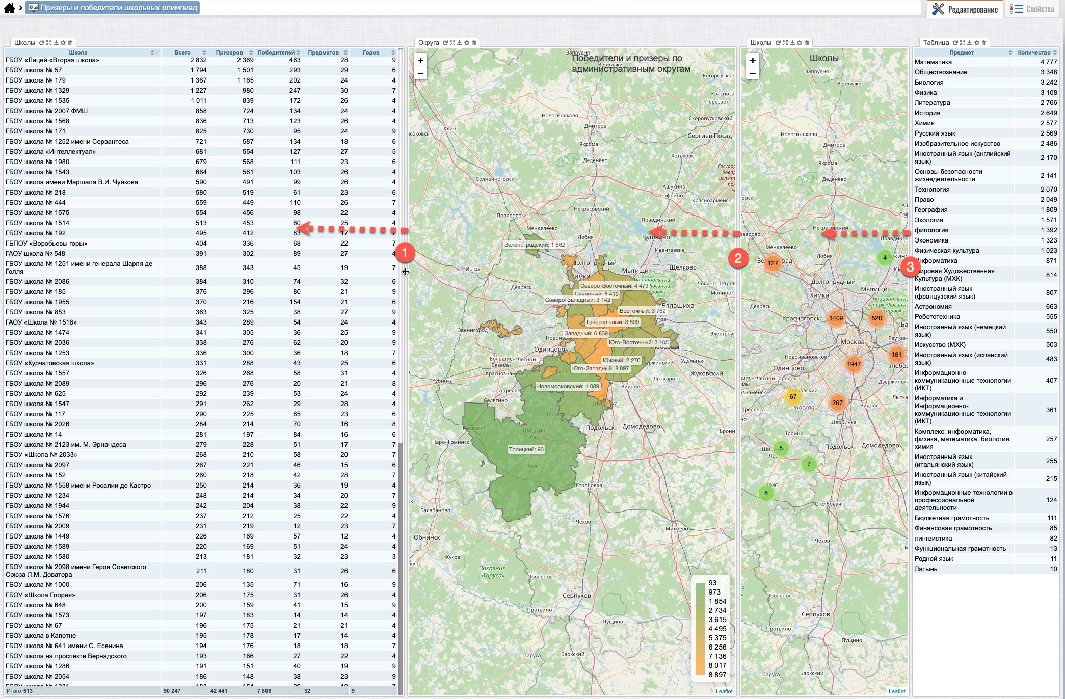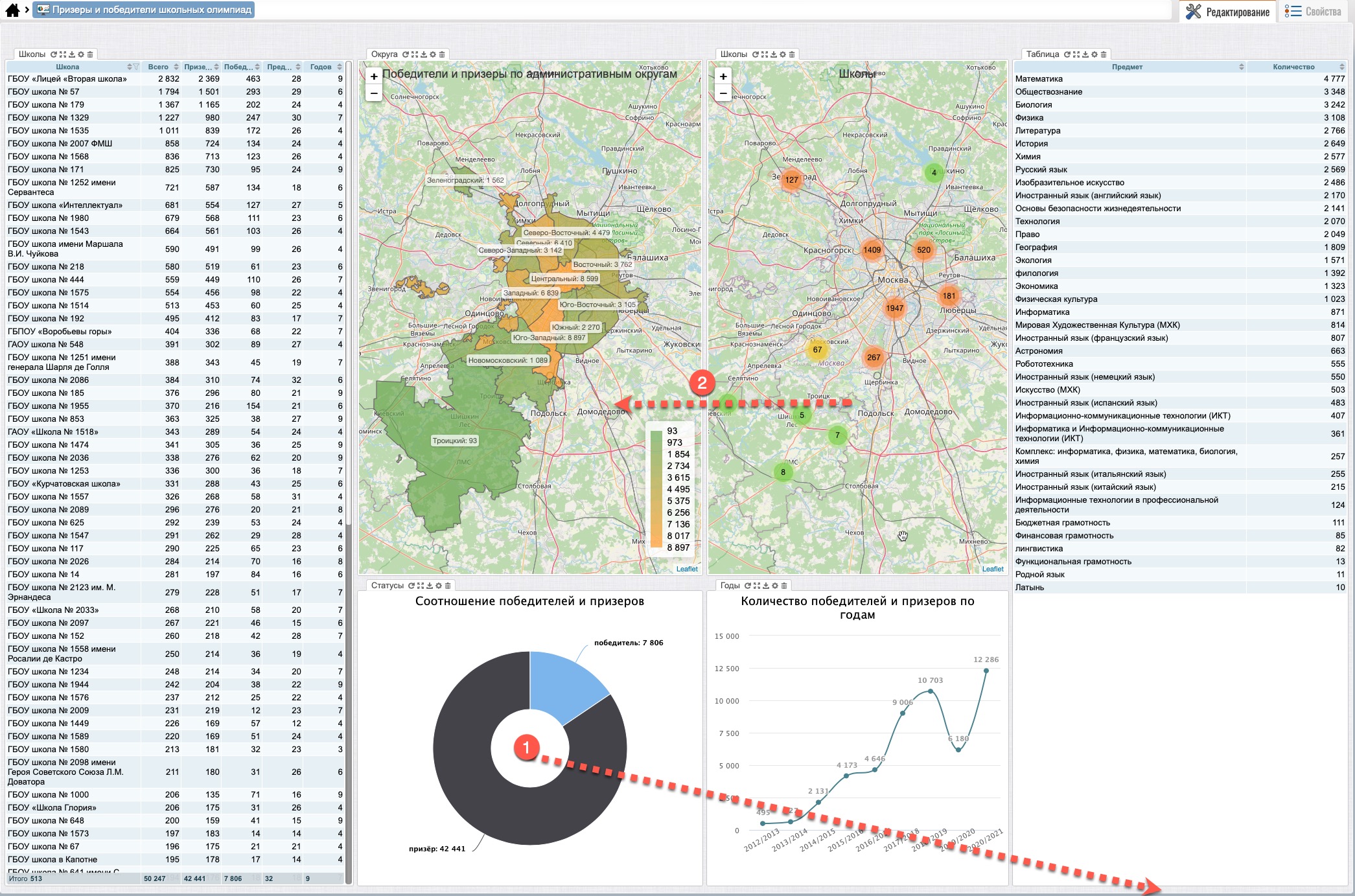 После перемещения виджетов (рис. 103) виджет “Школы” (карты) будет находиться на закладе, рядом с виджетом “Округа” (карта) (1), выбрав которую виджет “Школы” откроется на переднем плане поверх виджета “Округа”.