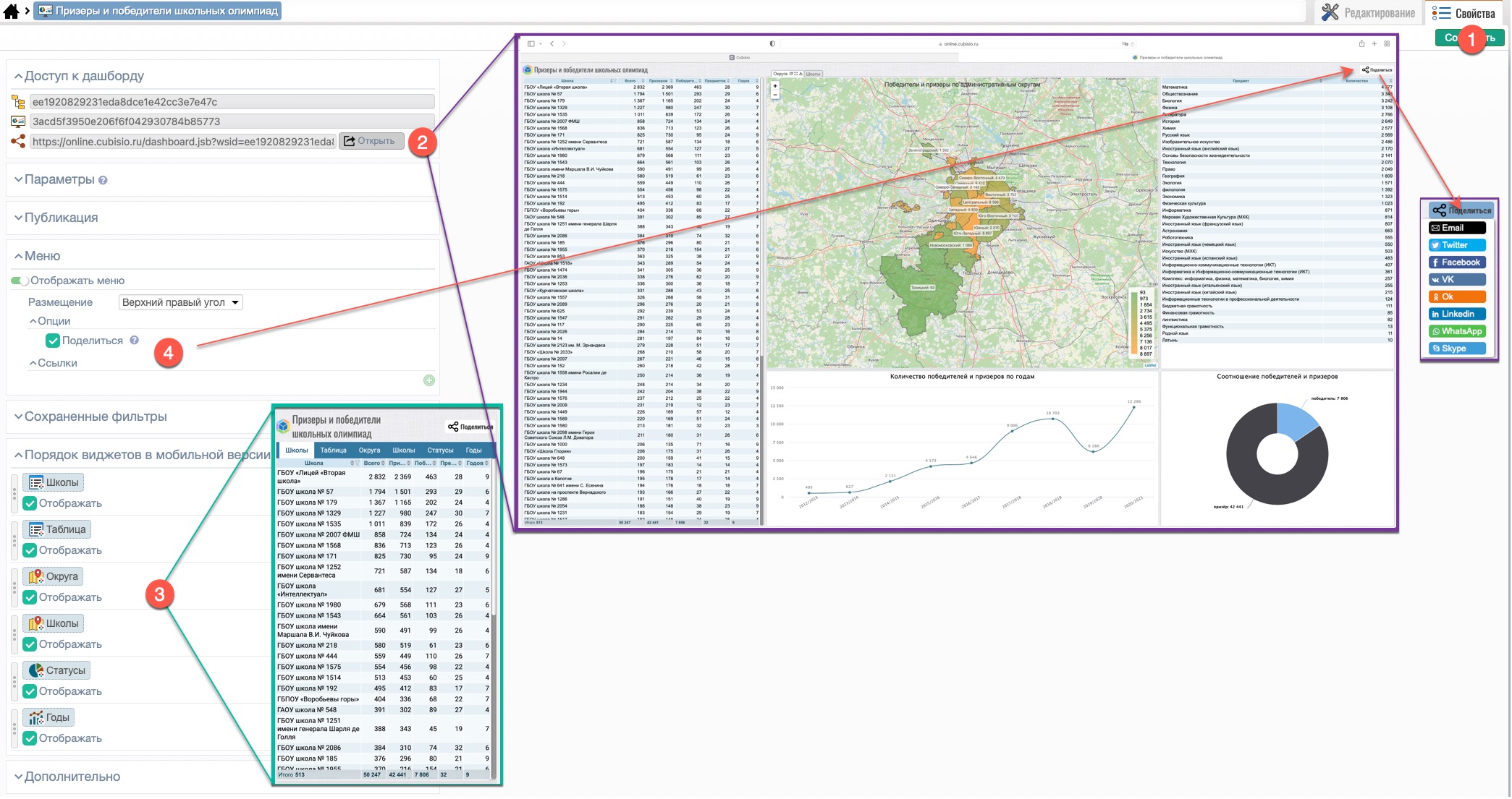 если включить опцию “Поделиться” (4), то конечный пользователь из браузера может, нажав на кнопку “Поделиться” (правый верхний угол дашборда) разместить ссылку на дашборд в социальных сетях или переслать ее по почте;