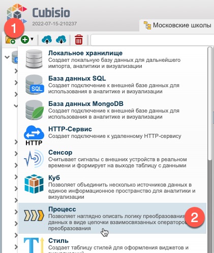Для настройки процесса последовательно нажмите на кнопку “+” (1) на панели инструментов и выберите строку “Процесс” (2) (рис. 107)