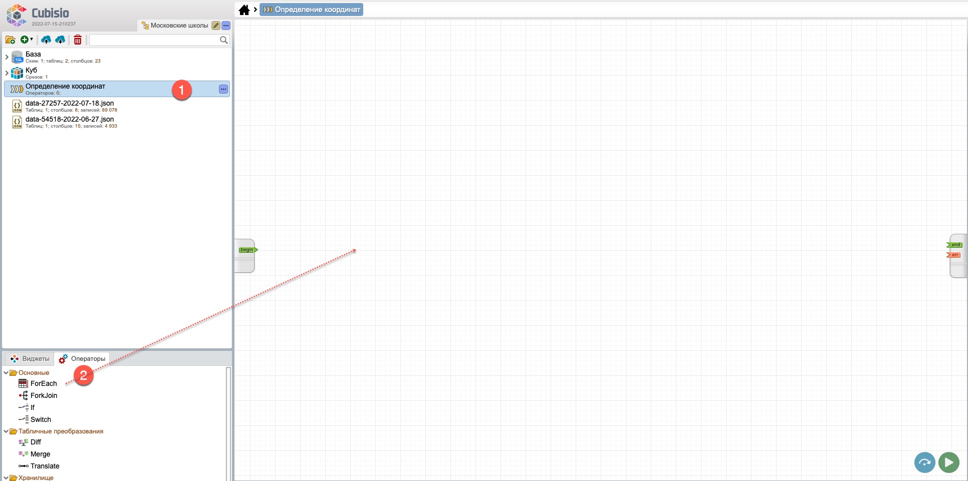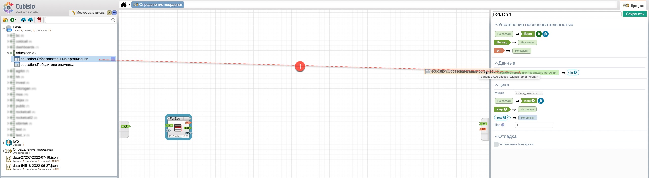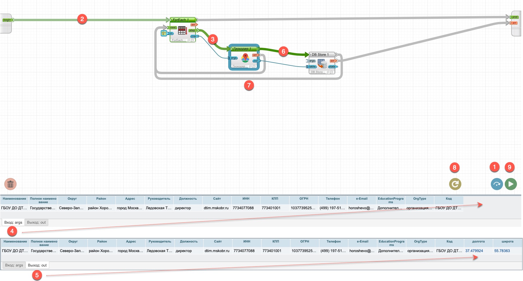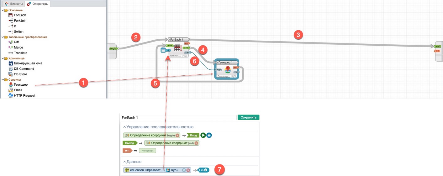 передачу порции данных из оператора “ForEach” для обработки в сервис “Геокодер 1” (6).