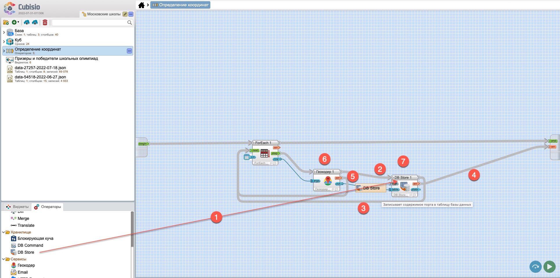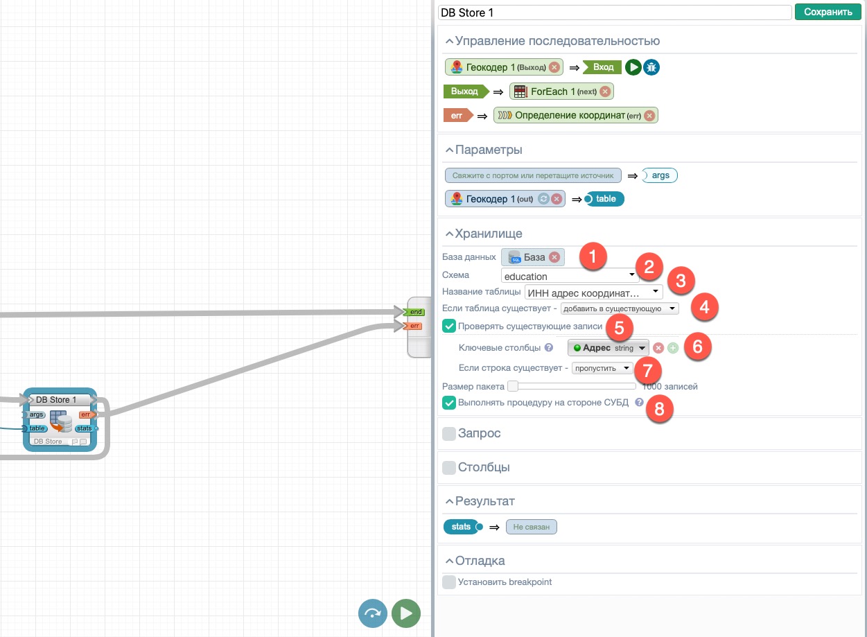передачу порции данных из оператора “Геокодер 1” для сохранения в БД “DB Store 1” (5).