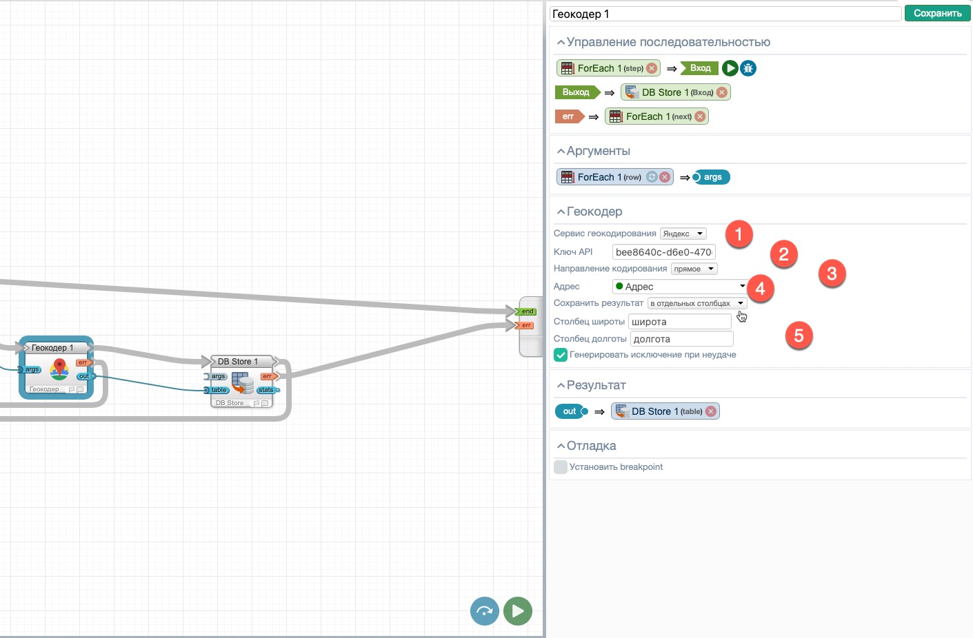 передачу управления для каждой записи “ForEach” на запуск сервиса “Геокодер 1" (4);