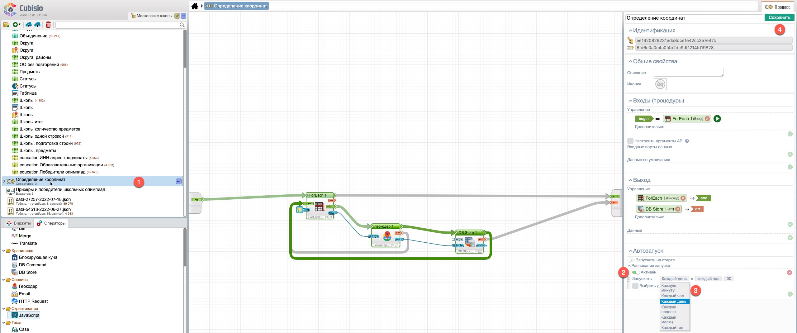 второе нажатие - считана первая запись среза “Образовательные организации” - управление и данные переданы “Геокодер 1” (3);