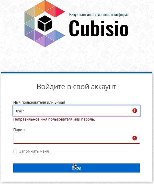 При неправильном вводе имени пользователя и/или пароля при входе в визуально-аналитическую платформу Cubisio под полем “Имя пользователя или E-mail” (порядок описан в п. 3.1.1. Авторизация) появится сообщение: “Неправильное имя пользователя или пароль” (рис. 4.1).