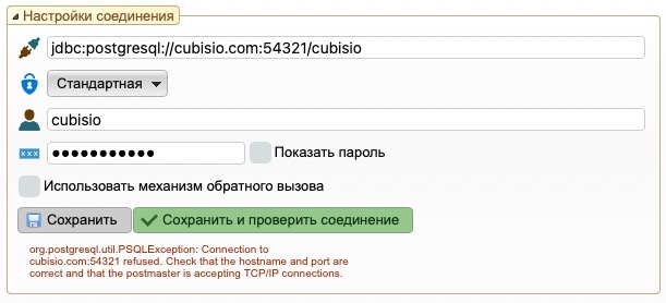 При неправильном вводе имени или адреса сервера базы данных или порта (порядок описан в п. 3.4.1. Настройка соединения с базой данных) появится сообщение: “Connection to … refused” (рис. 4.3).