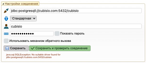 При неправильном вводе драйвера соединения с базой данных (порядок описан в п. 3.4.1. Настройка соединения с базой данных) появится сообщение: “No suitable driver found for …” (рис. 4.2).